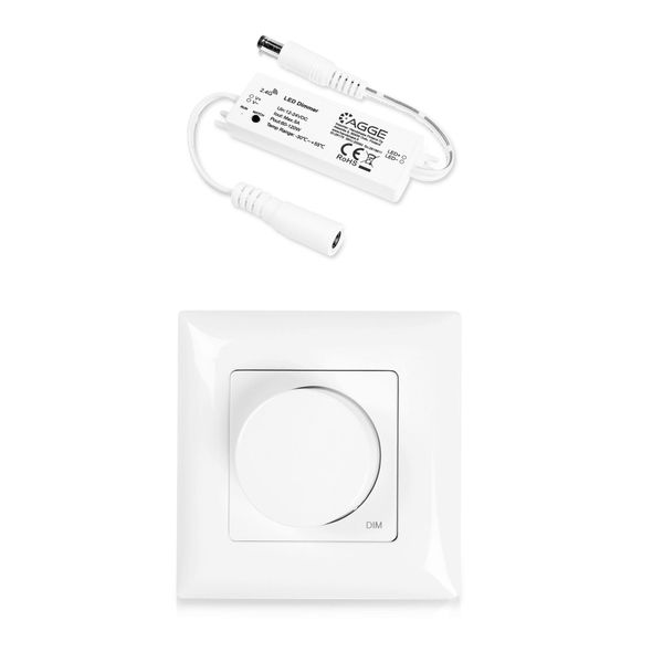 En driver for ensfargede LED-striper, som gjør det mulig å justere lysstyrken til LED-stripen med en separat fjernkontroll eller veggmontert dimmerbryter. Kommuniserer via en 2,4 GHz-frekvens. Beregnet for tørr innendørs bruk (IP20), maks. belastningskapasitet 5A.