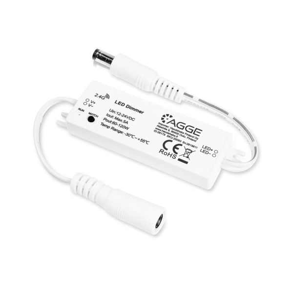 AGGE Single Color Mini Controller er en driver for ensfargede LED-striper som gjør det mulig å justere lysstyrken helt trinnløst og fjernstyre belysningen med en fjernkontroll. Driveren installeres mellom LED-stripen og transformatoren/strømforsyningen ved hjelp av ferdige kontakter. Driveren mottar deretter kommandoer fra fjernkontrollen og regulerer lyset deretter. Driveren kommuniserer via en 2,4 GHz-frekvens og kan kobles sammen med alle fjernkontroller som bruker samme frekvens. Driveren har en rekkevidde på opptil 30 meter ved klar sikt. Driveren er utstyrt med beskyttelse mot overoppheting, overbelastning, kortslutning og omvendt polaritet. Beregnet for tørre rom innendørs (IP20). To års garanti (24 måneder).