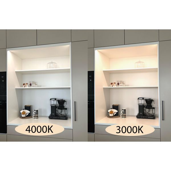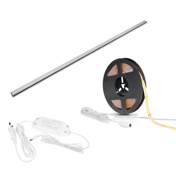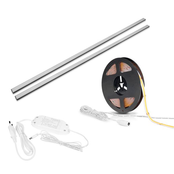 Aluminiumsprofilene som følger med i pakken, er egnet for utenpåliggende montering og er utstyrt med en frostet kuppel som sprer lyset jevnt og sørger for en pen installasjon. Transformatoren er dimensjonert etter LED-stripens effekt og lengde, og har en kontakt som passer direkte på stripen. Transformatoren kan kobles til en stikkontakt ved hjelp av støpselet på strømledningen, men installasjonen kan også gjøres permanent ved enten å kutte støpselet eller koble fra strømledningen fra transformatoren og koble strømforsyningen direkte til transformatoren. Aluminiumsprofilene kan festes til skapet enten ved å bore eller med de separate brakettene som følger med.